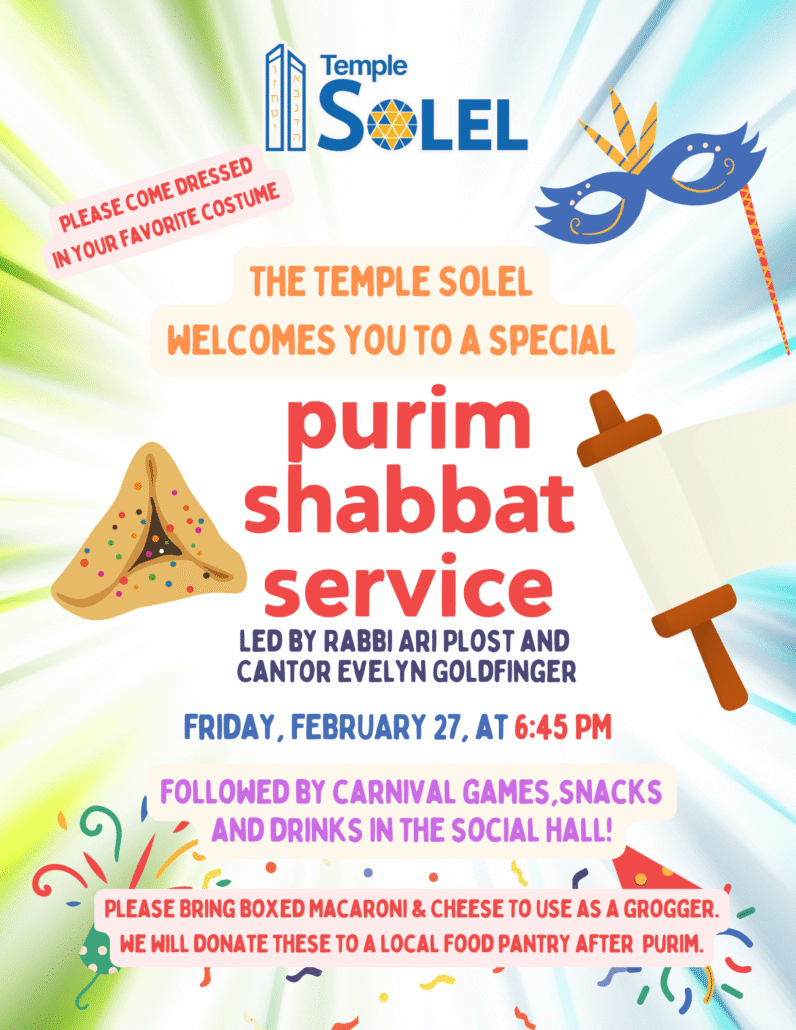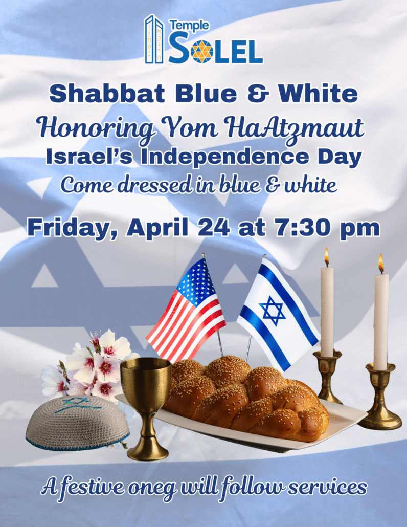 At Temple Solel, we are committed to making our services accessible to all by offering both in-person and virtual worship experiences. Whether you join us in our sanctuary or from the comfort of your home, we want you to feel connected to our congregation and our sacred community.